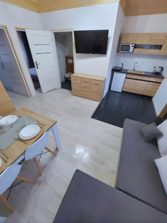 Jeśli zamiast domku wolisz apartament lub pokój, zapraszamy do naszego drugiego obiektu położonego tuż obok. Pensjonat nad Stawem to klimatyczne miejsce z wieloletnią tradycją, oferujące m.in. świetlicę z pokojem zabaw (ping-pong). Idealna alternatywa dla par i mniejszych grup.
